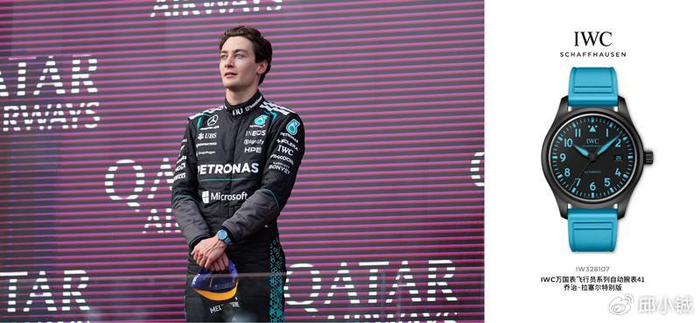 拉塞尔的腕间佩戴的飞行员系列自动腕表41“乔治·拉塞尔”特别版(IW328107),由其与品牌创意团队联手打造,黑色陶瓷表壳搭配标志性蓝色夜光元素,钛金属表底镌刻专属车号“63”,全球限量1063枚。腕表搭载自制32112机芯,120小时超长动力储备,防磁软铁内壳、旋入式表冠适配赛场复杂环境,中央秒针擎停装置实现精准计时,与拉塞尔的赛场节奏完美契合。