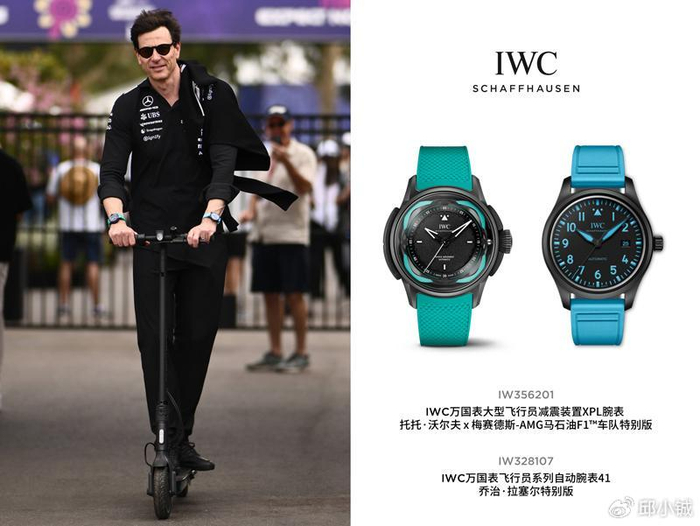 赛场之上运筹帷幄,赛场之下托托·沃尔夫的腕间选择,更是与车队深度绑定的象征。他同时佩戴IWC万国表大型飞行员减震装置XPL腕表“托托·沃尔夫x梅赛德斯”特别版(IW356201)与拉塞尔特别版(IW328107),成为赛场外的独特风景。